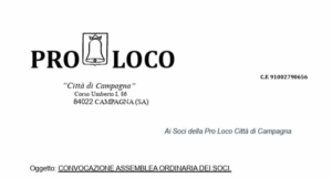 Si rende noto che i Soci della Pro Loco Città di Campagna APS sono convocati in Assemblea Ordinaria presso la Sala “G. D’Ambrosio” del Palazzo